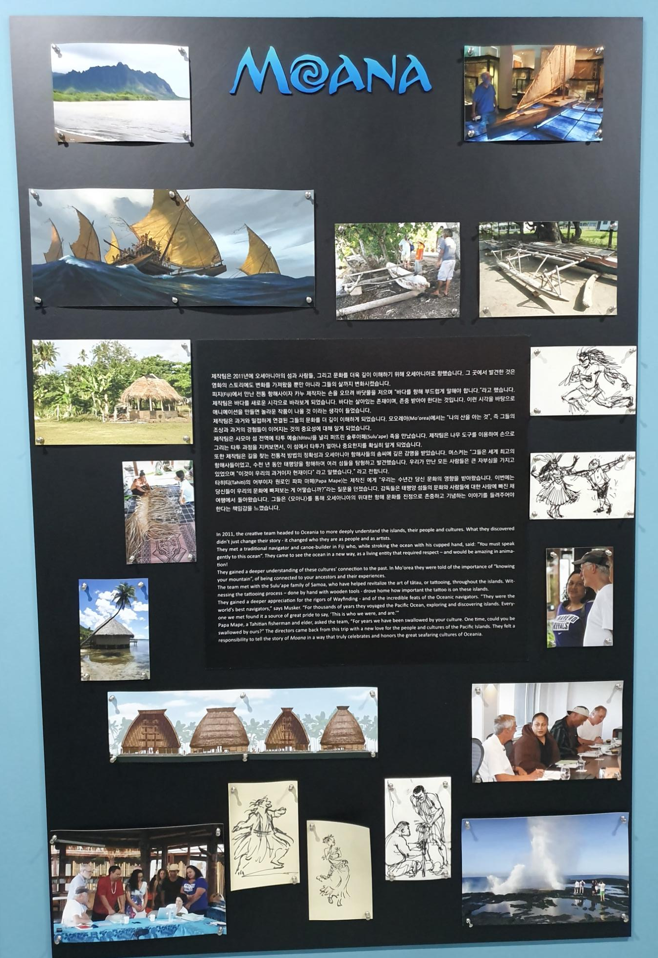 모아나를 제작하기 위해서 직접 오세아니아에 있는 섬을 답사하면서 원주민들을 만나고, 그들의 철학을 배우는 등 애니메이션 제작을 위해 들인 노력을 적은 부스입니다. 하나의 작품을 만들기 위해서 엄청난 노력을 하는 것을 다시금 느낄 수 있었던 부분이었습니다.