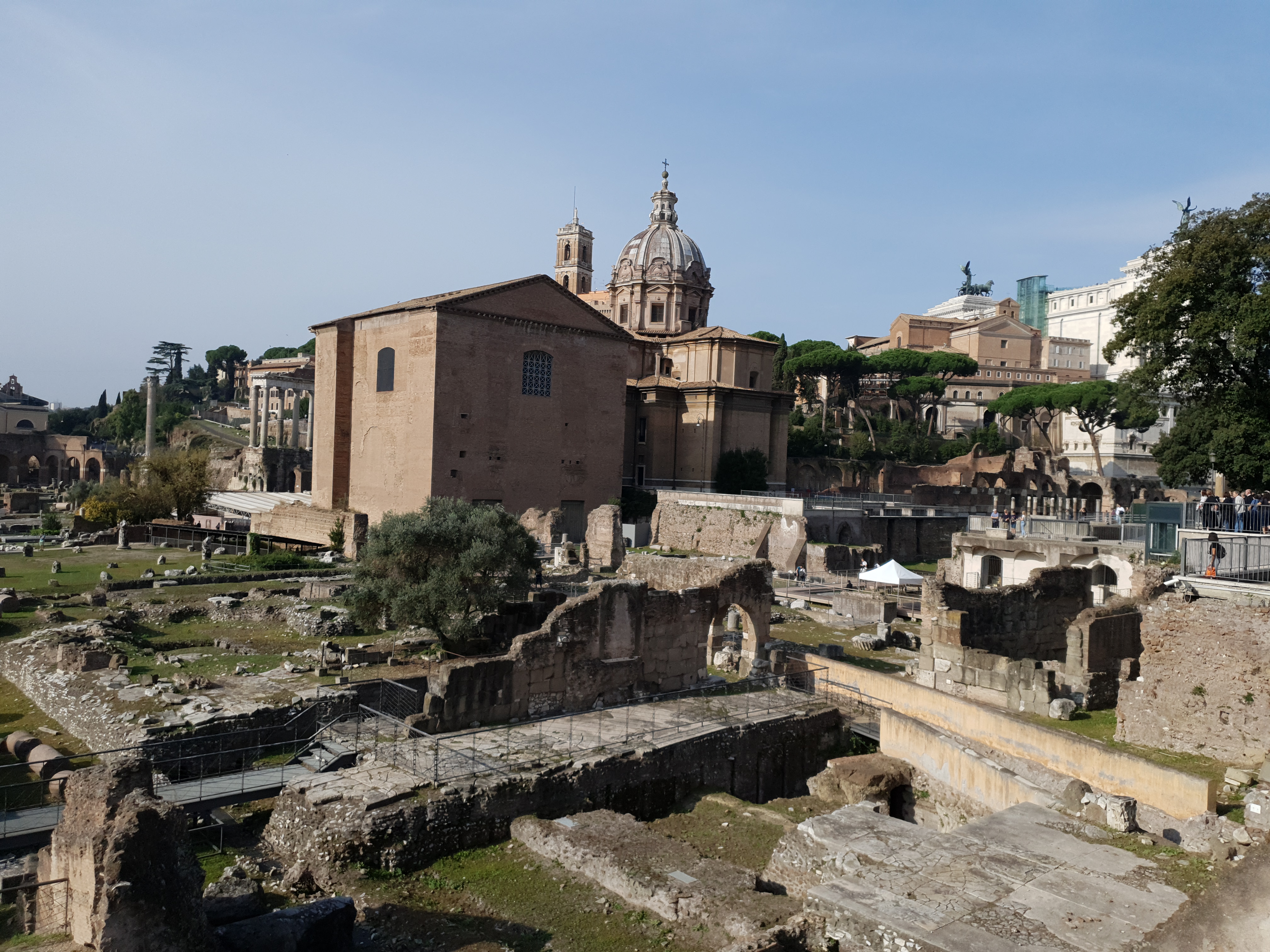 이 곳은 '포로 로마노', 옛 로마의 광장이었던 곳입니다. 고대 로마 정치의 핵심 중 하나인 원로원도 여기에 있었다고 합니다. 멀리 보이는 돔 형태의 건물은 교도소라고 합니다. 교도소마저도 멋있어 보입니다.
