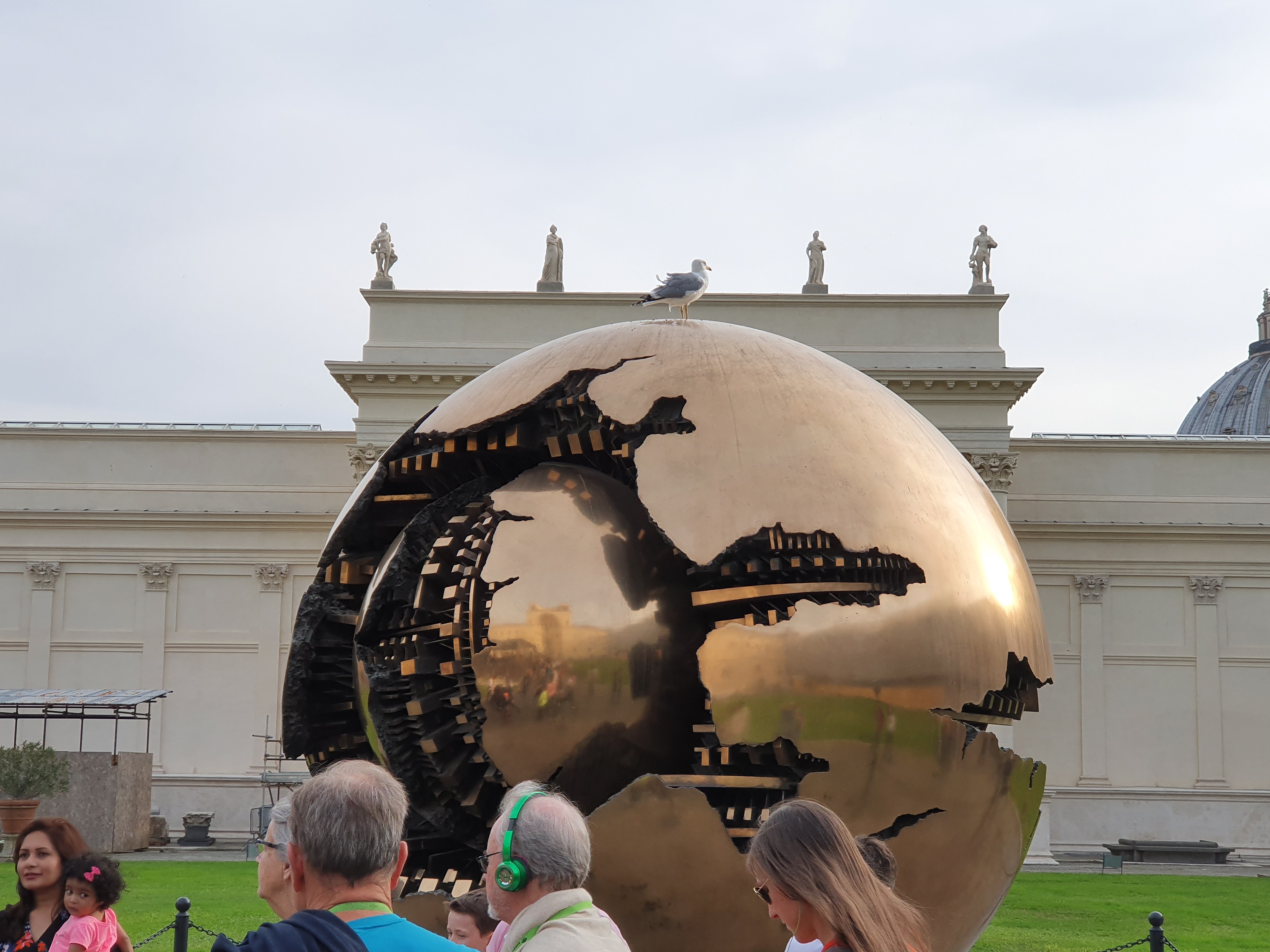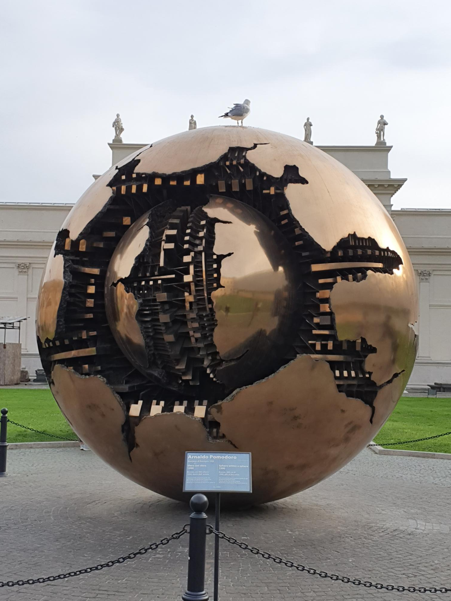 '지구 속의 지구'(Sphere within Sphere)란 작품으로 망가져가는 지구를 표현한 작품이라고 한다. 참고로 저 작품은 회전시킬 수 있다. 사진을 자세히 보면 새 한 마리가 작품 위에 올라가 있다. 저 새는 구가 회전하는 것은 아랑곳하지 않고 꿋꿋이 자기 자리를 지키고 있었습니다. 마치 자기가 지구를 수호하겠다는 것처럼 말입니다.