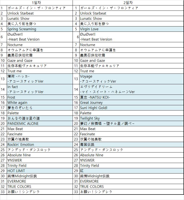 양일차의 세트리스트 중 다른 부분을 색깔로 표시를 했는데, 보시는 바와 같이 상당수의 세트리스트가 동일한 것을 알 수 있었습니다. 사실 핑크 체크 스쿨이나 트라프리 곡 정도는 다른 곡을 해줄 것이라고 생각을 했었는데, 그런 부분은 살짝 아쉽게 느껴지기도 했습니다.