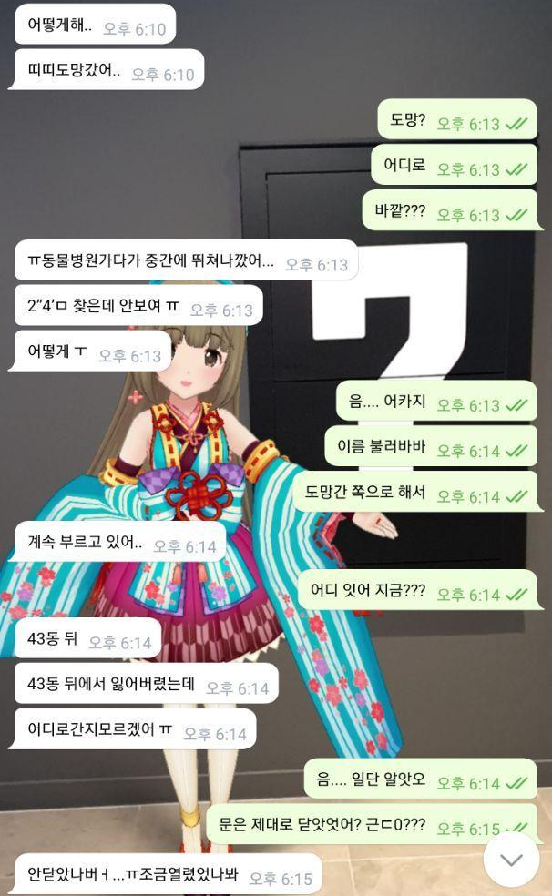 - 18:15 집 근처에서 도망갔다는 연락을 받음. 바로 회사에서 퇴근