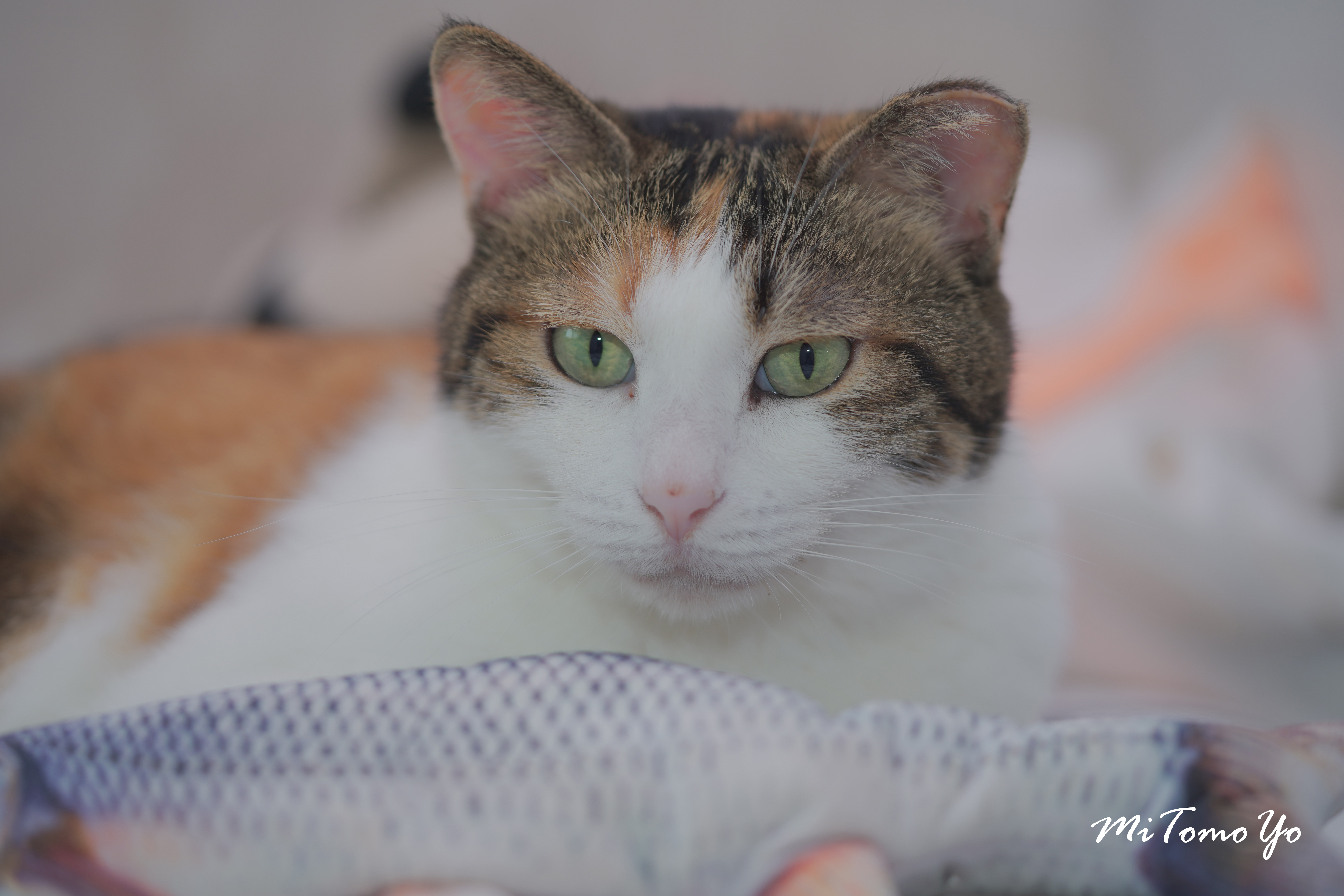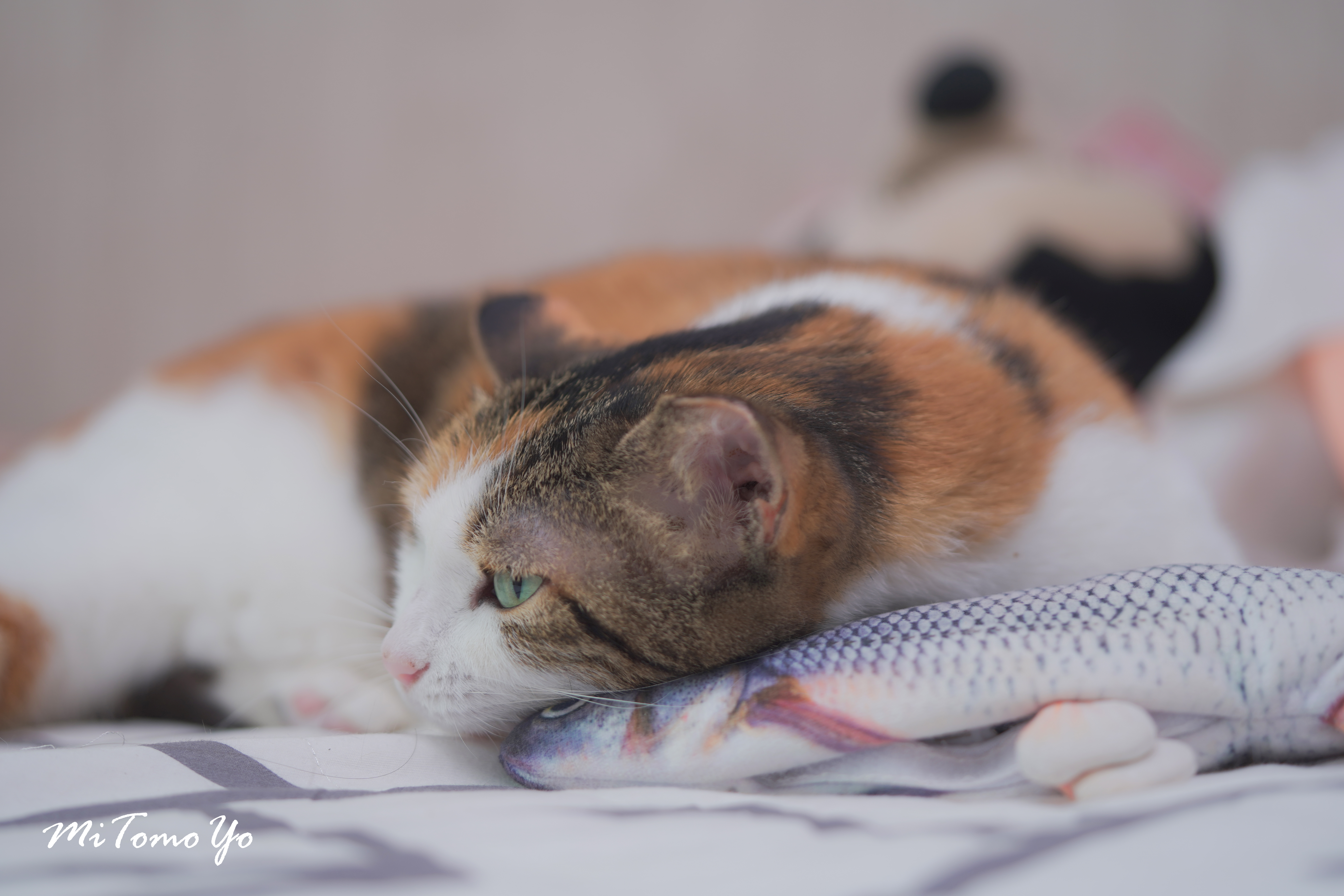 생선 장난감을 배게 삼아서 자고 있는 모습을 찍었습니다.