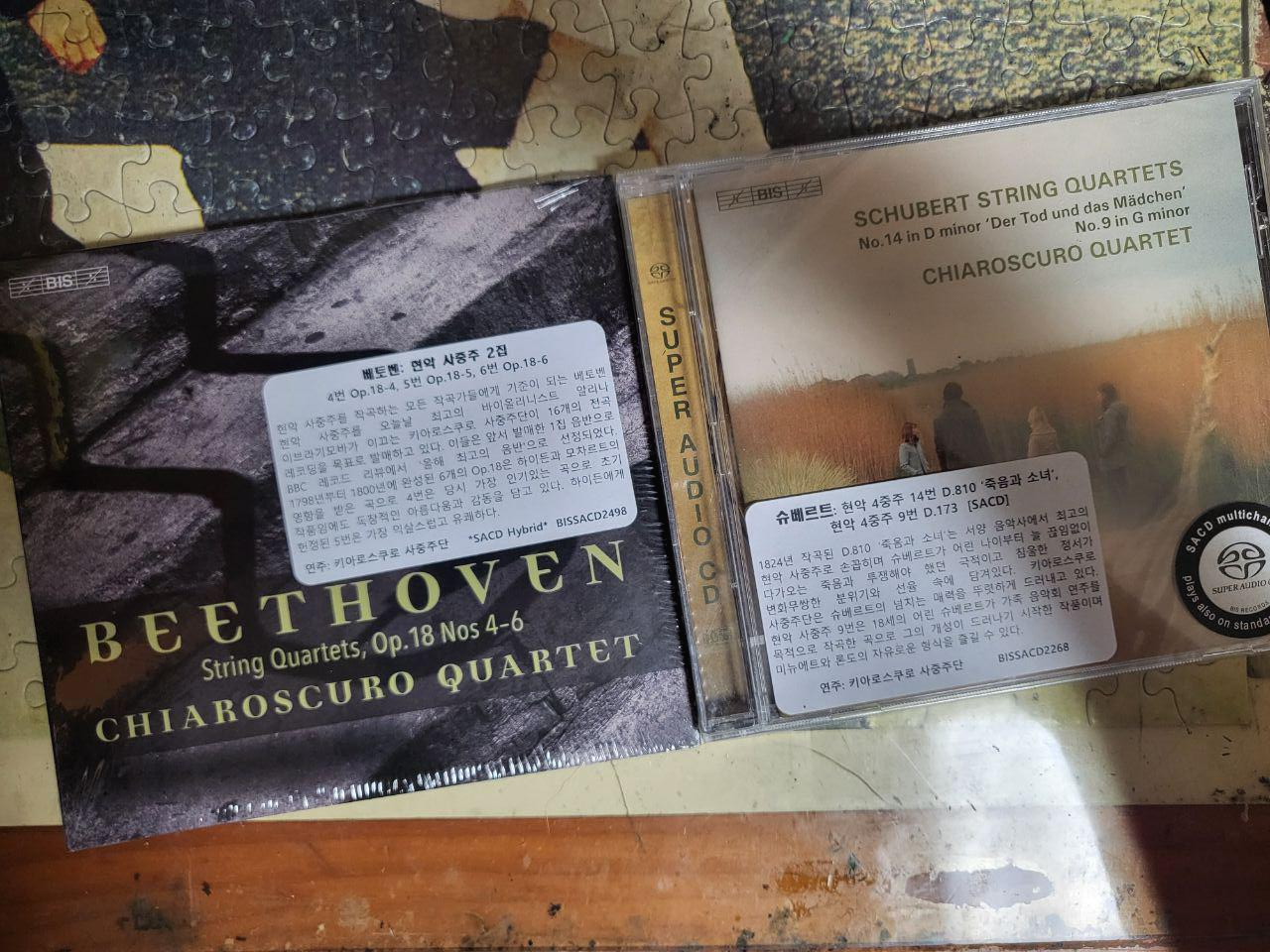 시대악기를 이용한 키아로스쿠로 사중주단의 두 개의 음반으로, 베토벤 현악 사중주 시리즈는 계속해서 녹음해서 발매를 해줬으면 하는 마음에 구입했다. 겸사겸사 슈베르트의 현악 4중주 음반도 같이 구입을 했는데, 죽음과 소녀야 많이 들었으니 그렇다 치고, 상대적으로 조명을 덜 받는 9번 현악 사중주가 수록되어 있는데, 들어본 적이 없는 곡이다 보니 궁금해진다.