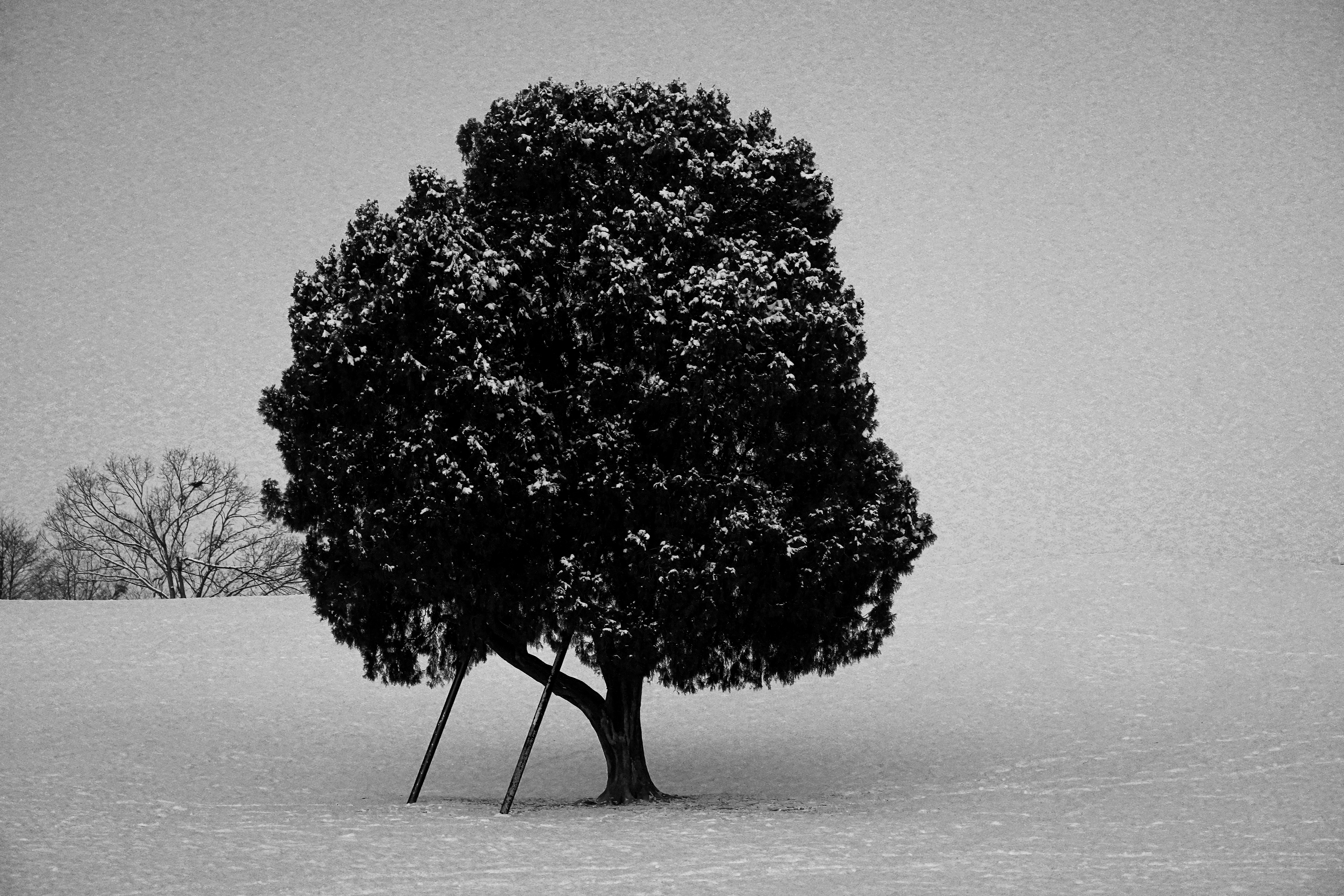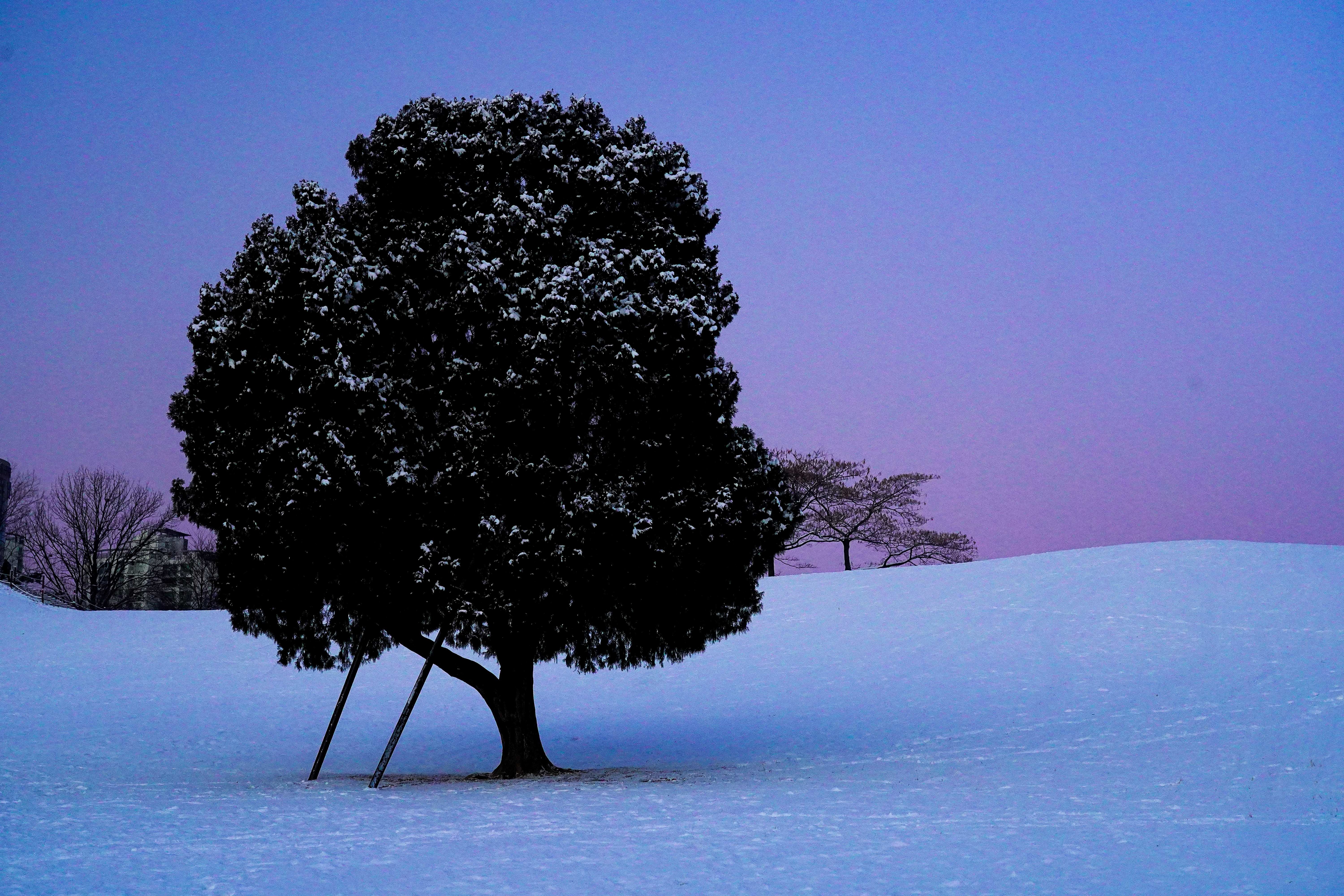 나홀로 나무 언덕 뒤쪽으로 건물들이 미묘하게 보이는데, 이것들이 보이지 않는 각도를 찾기 위해서 이리저리 움직이고 눈밭에서 무릎을 꿇고 사진을 찍었던 기억이 납니다.
