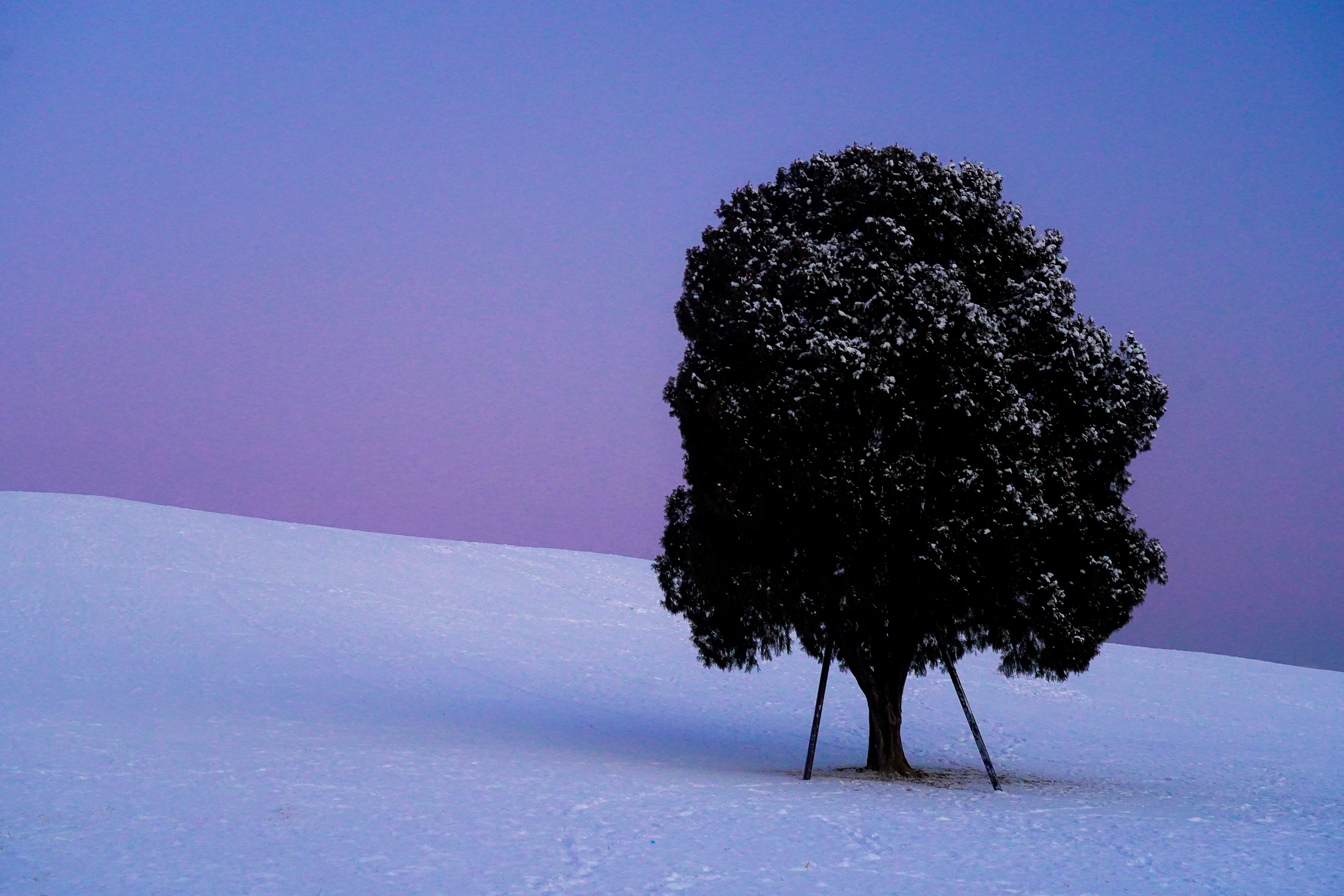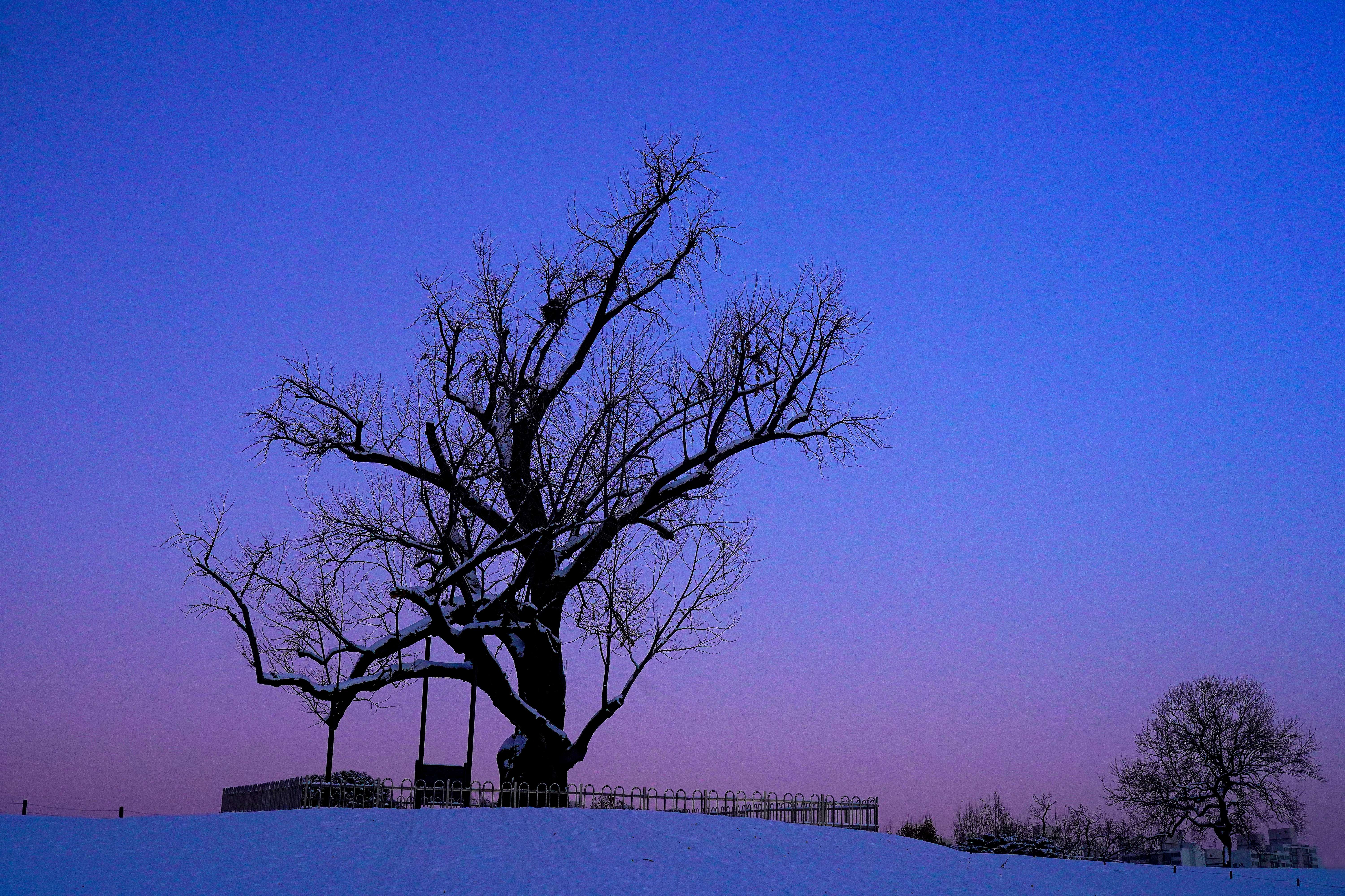 나홀로 나무 언덕 뒤쪽으로 건물들이 미묘하게 보이는데, 이것들이 보이지 않는 각도를 찾기 위해서 이리저리 움직이고 눈밭에서 무릎을 꿇고 사진을 찍었던 기억이 납니다.