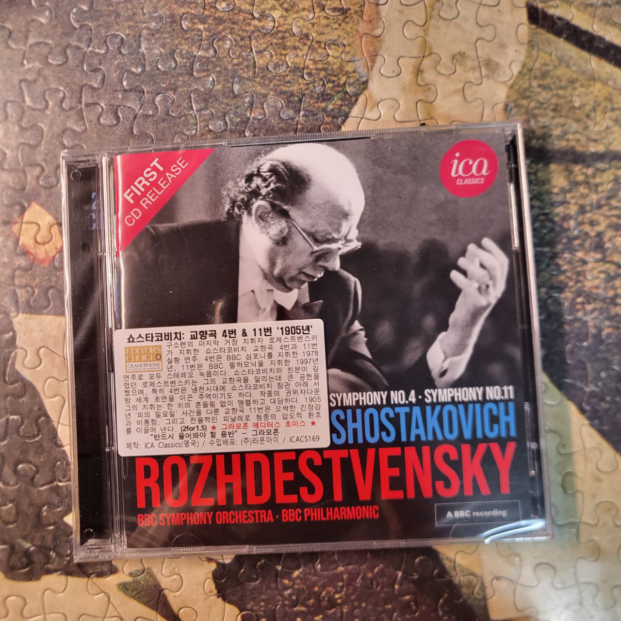 게나디 로제스트벤스키의 쇼스타코비치 교향곡 음반. 독특한 지휘법, 단 한 번 서울시향을 지휘했지만 잊을 수 없는 연주를 들려줬던지라 왠지 모르게 더 특별하게 느껴지는 분이다. 쇼스타코비치를 즐겨듣는 편은 전혀 아니지만, 4번과 11번 교향곡은 그래도 좋아하는 편인지라 구입한 음반이다.