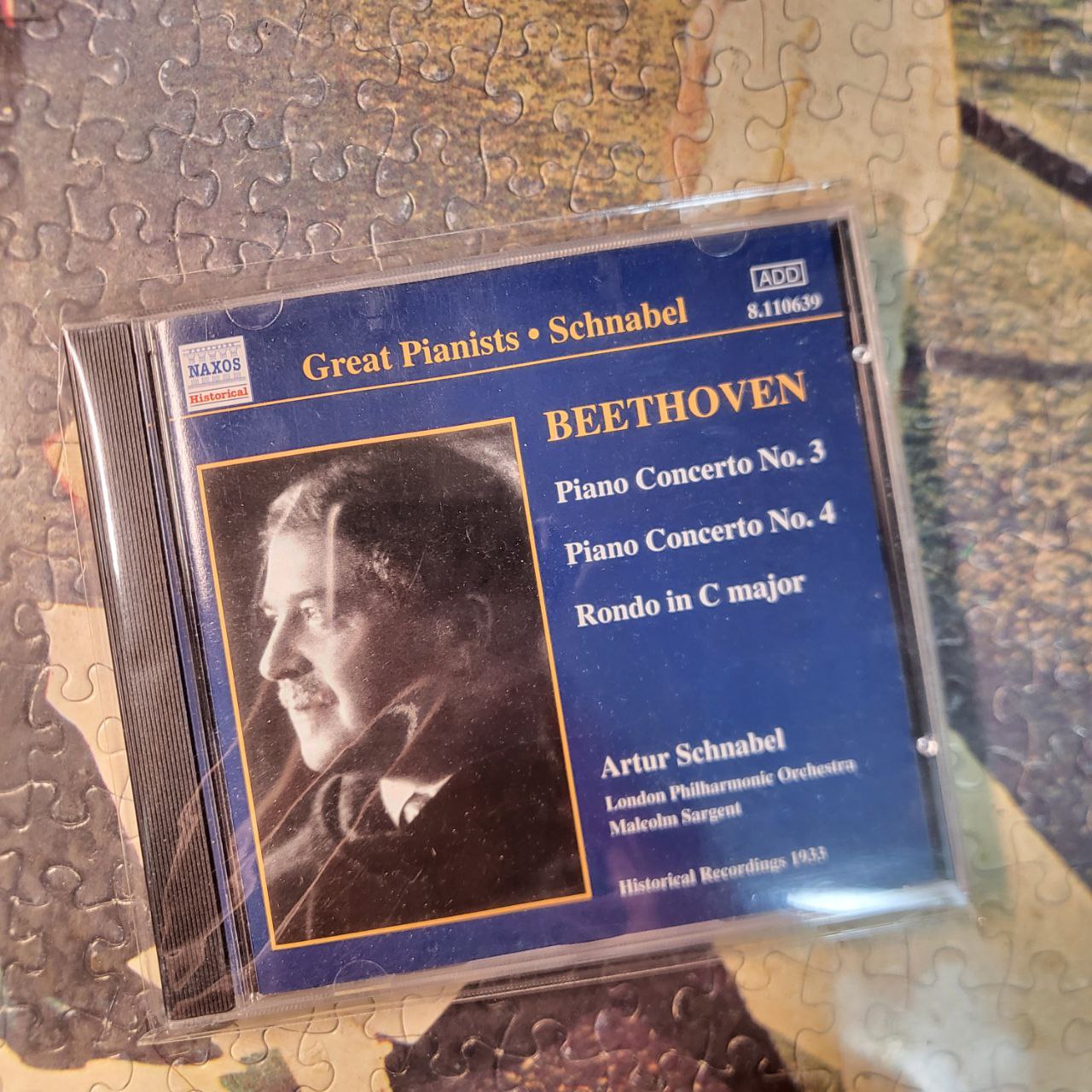아르투르 슈나벨의 베토벤 피아노 협주곡 음반. 자글거리는 노이즈를 뚫고 들리는 슈나벨의 피아노 연주에서 전율을 느끼는 경우가 적지 않은데, 협주곡에서도 그런 순간을 맞이할 수 있을지 궁금하다.