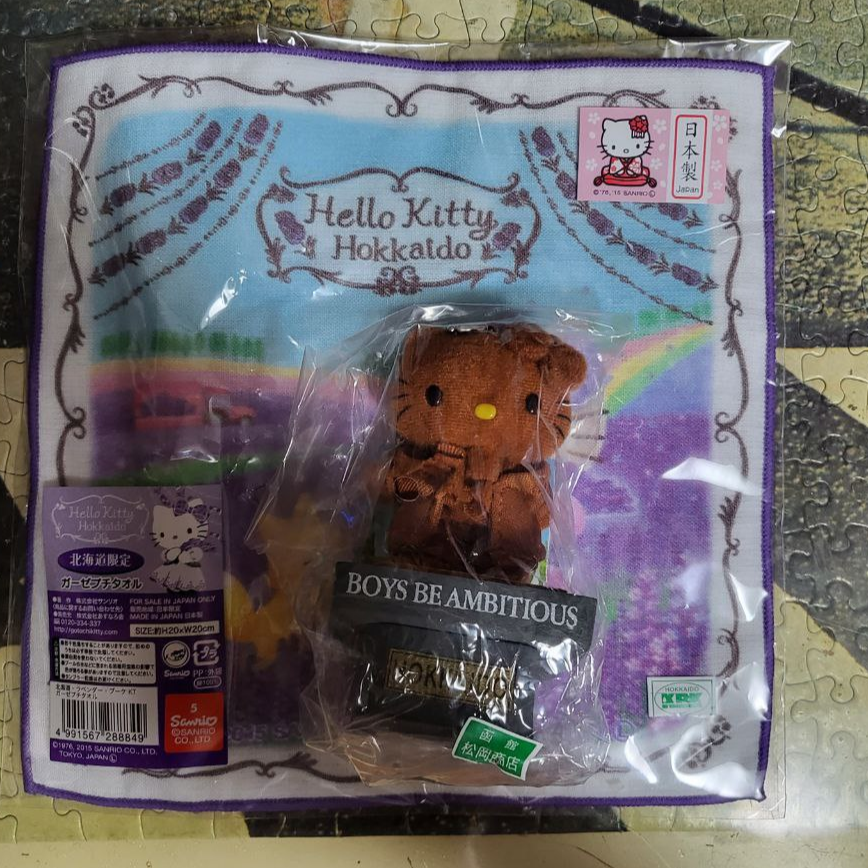 역시 뭔가 더 살 것이 있었다! 내건 아니지만, 동생이 좋아하는 키티 중에서 괜찮아 보이는 것이 있어서 집어 들었다. 홋카이도 대학교에 지대한 공헌을 한 윌리엄 스미스 클라크의 명언 'Boys be ambitious'를 본뜬 키티 인형이 눈에 들어와서 집어 들었다. 손수건은 덤.