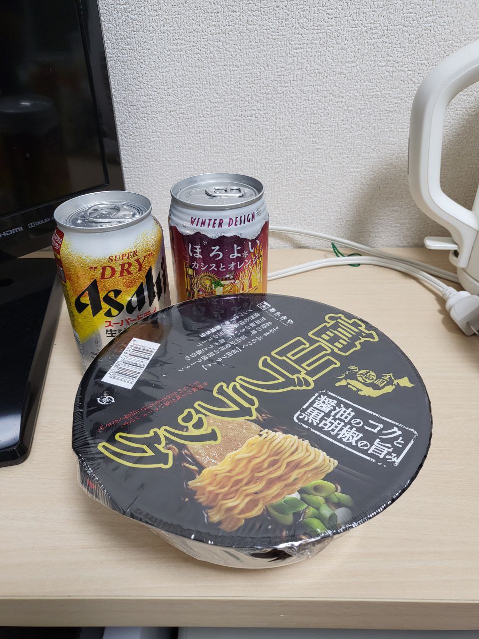 그리고 먹은 후지 블랙 컵라면과 호로요이, 그리고 말로만 듣던 아사히 슈퍼 드라이. 거품이 생기는 것이 신기하긴 하더라.