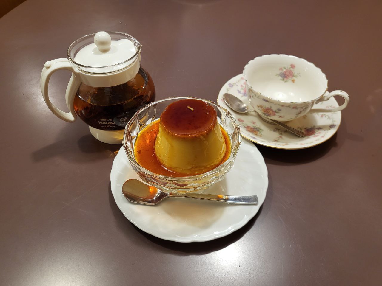 친구는 드립커피와 기본 롤케익, 저는 얼그레이 티와 푸딩을 주문했습니다. 원래 푸딩을 먹을 계획은 없었고 현지 특산품(이름은 정확히 기억나진 않는데 고구마 종류였었던 것 같음)이 들어간 롤케익을 주문하려 했는데 둘 다 품절이라고 해서, 그럼 있는 것 중에 추천을 해달라고 하니, 푸딩을 추천해서 먹은 것이었습니다. 은은한 단맛에 아래에 깔린 커피시럽이 무척 잘 어울려서 굉장히 만족스럽게 먹었습니다. 얼그레이도 꽤 괜찮았습니다.