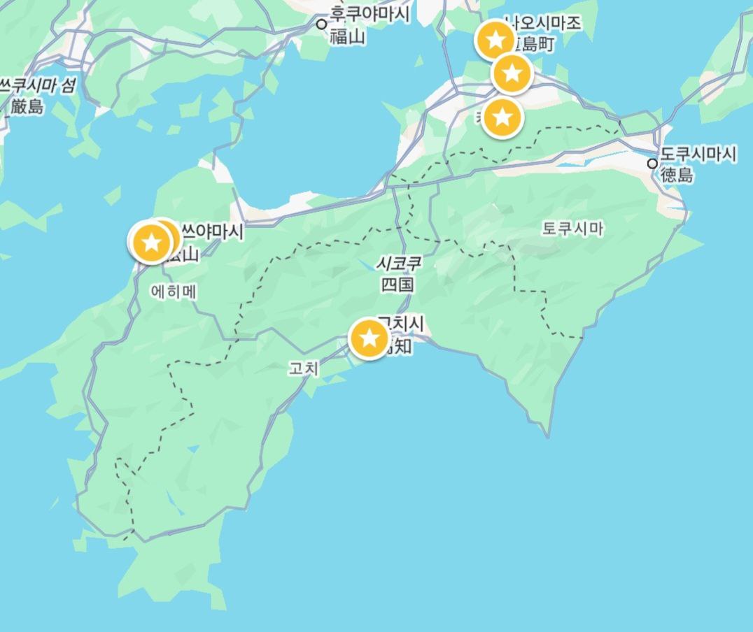 시코쿠는 일본어로 '四国'이라고 쓰고, 그 이름처럼 크게 4개의 지역으로 나눠져 있고, 각 현의 대표 관광지는 다카마쓰(카가와 현), 마츠야마(에히메 현), 도쿠시마(도쿠시마 현), 그리고 고치(고치 현)인 것 같습니다. 마음 같아서는 4개의 지역 모두 다녀오고 싶었지만 도저히 5박 6일 일정으로는 답이 나오지 않을 것 같아서, 이번 여행에서는 도쿠시마를 제외한 다카마쓰-고치-마츠야마만 다녀오게 되었습니다.