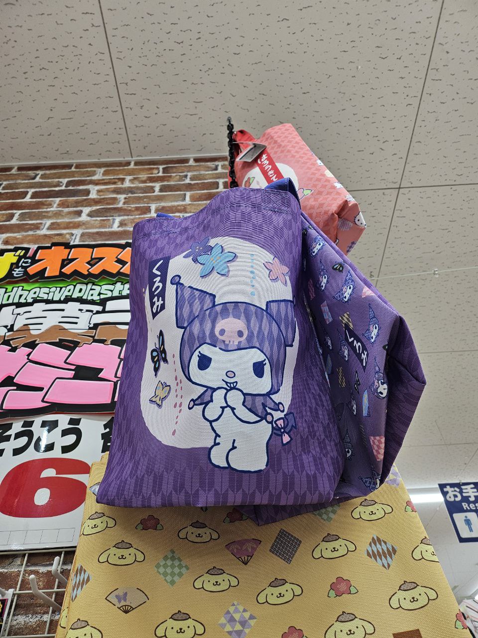 여기서 선물을 비롯한 여러 물건들을 일단 모두 구입했다. 사실 이런 쇼핑은 여행 마지막에 해야 불필요하게 많은 짐을 들고 이동하여 체력을 소진하는 일을 줄일 수가 있는데, 우리가 돌아갈 다카마쓰에는 이렇게 쇼핑을 할 수 있는 곳이(당시만 하더라도) 없는 줄 알았기에 이 날 가게 된 것이다. 나는 위스키(아빠 것), 콘드로이친Z(엄마 것), 인형들을 몇 개 샀고, 동생은 컵라면을 여러 개 구입했다. 오른쪽 사진의 에코백... 사고 싶었는데 저 위에 걸려 있어서 결국 빼내지 못하고 돌아왔다. 까비...