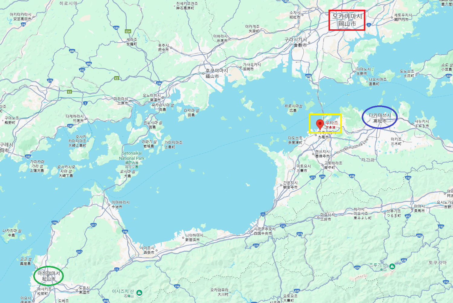 초록색이 마츠야마, 파란색이 다카마쓰, 노란색이 분기점인 우타즈 역, 그리고 빨간색이 오카야마다. 물론, 승무원이 검표를 할 때 '목적지가 어디신가요?'라고 물어보기에 만약 다른 열차를 탔다면 뒤의 열차를 타야 한다고 안내를 할 수도 있을 것 같지만, 일본어가 능숙하지 못해 이를 알아듣지 못한다거나, 이따가 자리를 옮겨야지라고 생각하고는 깜빡 잠이 들었다거나 한다면... 큰 문제가 발생할 테니 이 사실을 미리 알아두는 것이 좋을 것 같긴 하다.