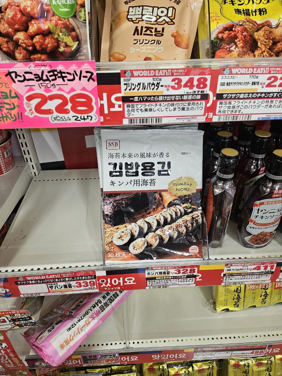 왼쪽의 사진은 '한국 코너'라고 해서 다양한 한국 음식들을 팔고 있었는데 '김밥용 김'이라고 하면서 キムパ(키무파)라고 적어둔 것이 굉장히 재미있게 느껴져서 사진을 남겨봤다. 산리오 코너는 오른쪽 사진처럼 굉장히 귀엽게 꾸며 놓았길래 사진을 남길 수밖에 없었다.