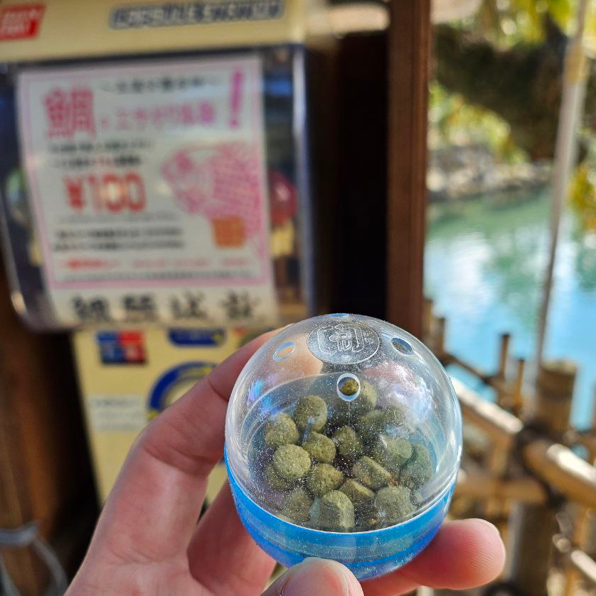 다카마쓰 성에는 물고기들의 먹이를 뽑을 수 있는 뽑기 머신이 여러 곳에 설치가 되어 있다. 동생이 물고기 먹이를 주고 싶다고 해서 동전털이도 할 겸 뽑아봤다.