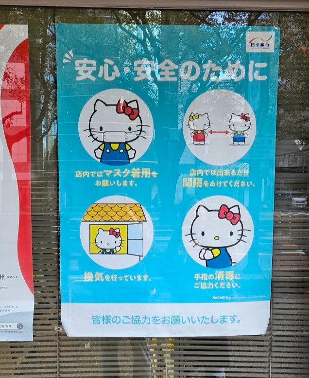 버스를 기다리는 중에 발견한 헬로키티의 방역 수칙 준수 캠페인 포스터.