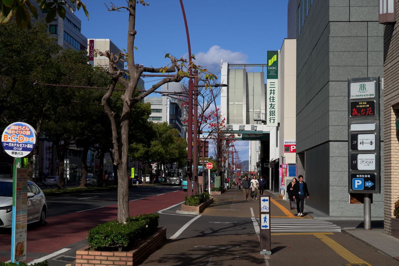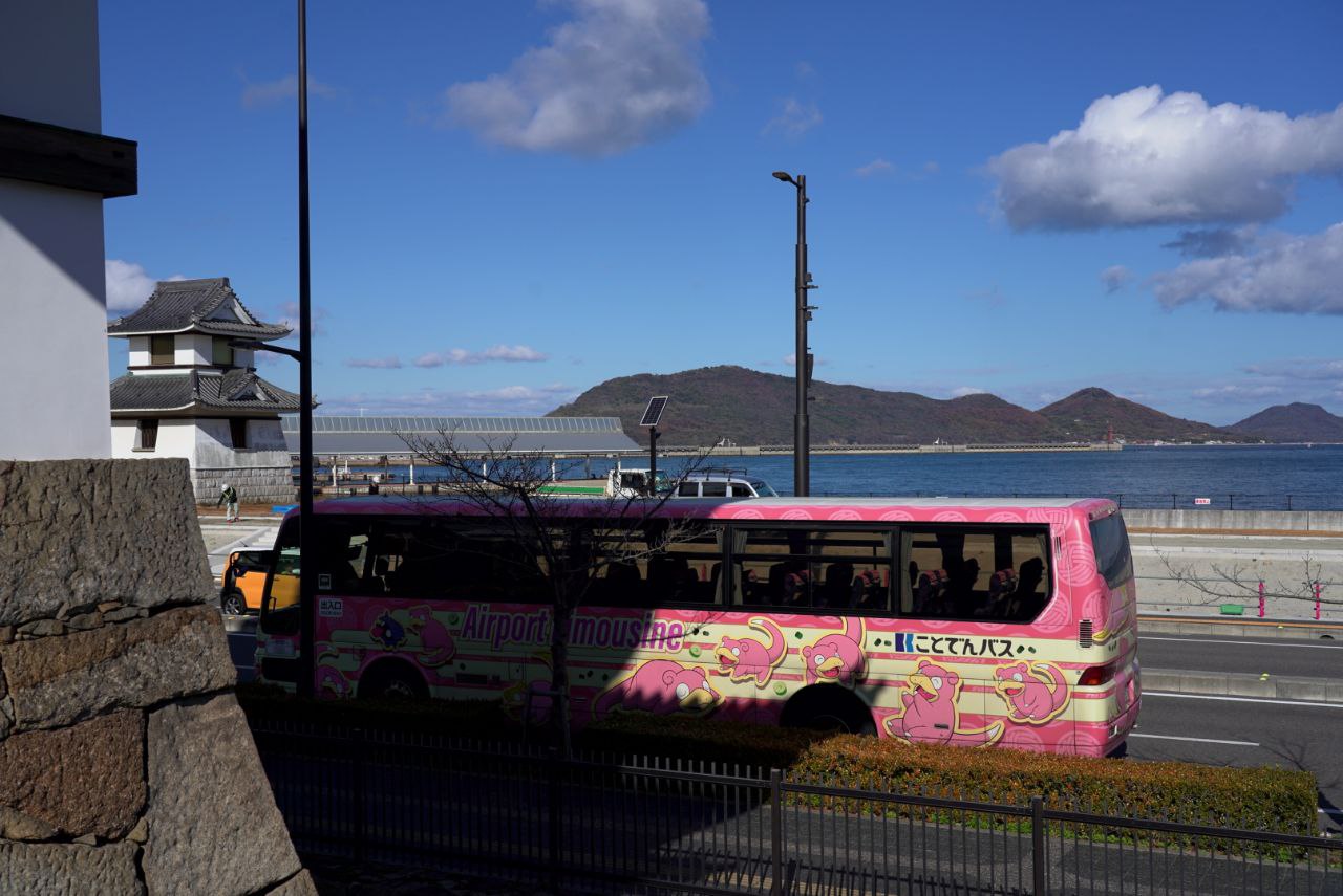 근처에서 발견한 공항 리무진. 야돈에 꽤나 진심인 듯한 다카마쓰를 느낄 수가 있다. 버스 뒤로는 망루로 쓰였을 것 같은 건물 하나가 보이는데, 다카마쓰 성이 이전에는 훨씬 큰 규모였음을 짐작하게 한다.