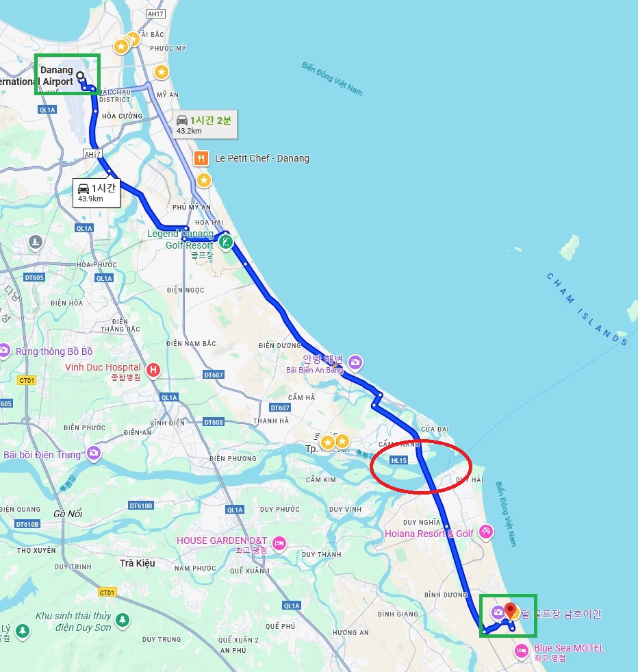 회사에서 지원해 주는 숙소는 VinPearl 리조트 남호이안이란 곳으로, 지도로는 크게 체감이 되지 않는 편인데 자동차로 1시간가량 이동해야 하는 곳에 위치해 있었다.