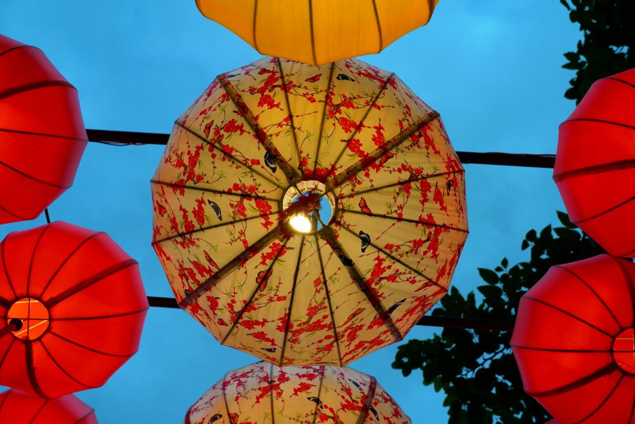 건물 위에 대롱대롱 매달린 풍등의 모습들.