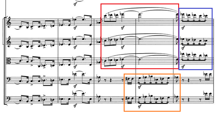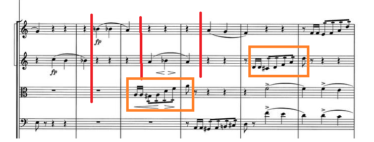 서로 주고받으며 프레이즈가 이어지는 부분을 확실하게 구분 짓고(빨간색), 그 와중에 16분 음표(주황색)를 확실히 강조하여 음악에 혼돈감을 조금 더 부여한다거나,